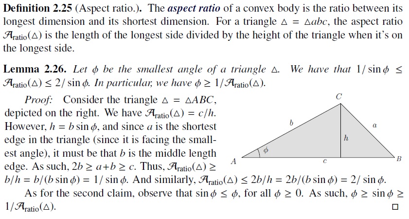 جواب: نقطه r را که دورترین نقطه نسبت به pq است در نظر میگیریم. میدانیم pq یک ۲-تقریب از قطر نقاط است و r یک ۴-تقریب از عرض نقاط است. مساحت مثلث pqr بر حسب قطر و عرض نقاط به دست میآید. حالا باید مساحت مثلث بهینه را بر حسب قطر و عرض نقاط به دست بیاوریم. بدیهی است که مساحت هر مثلث (از جمله مثلث بهینه) در رابطه زیر صدق میکند: