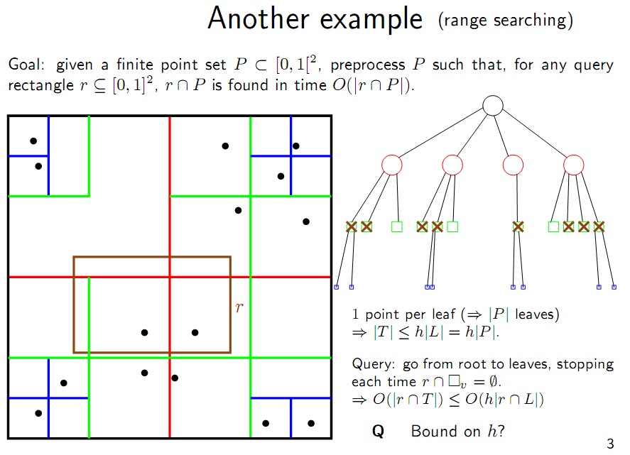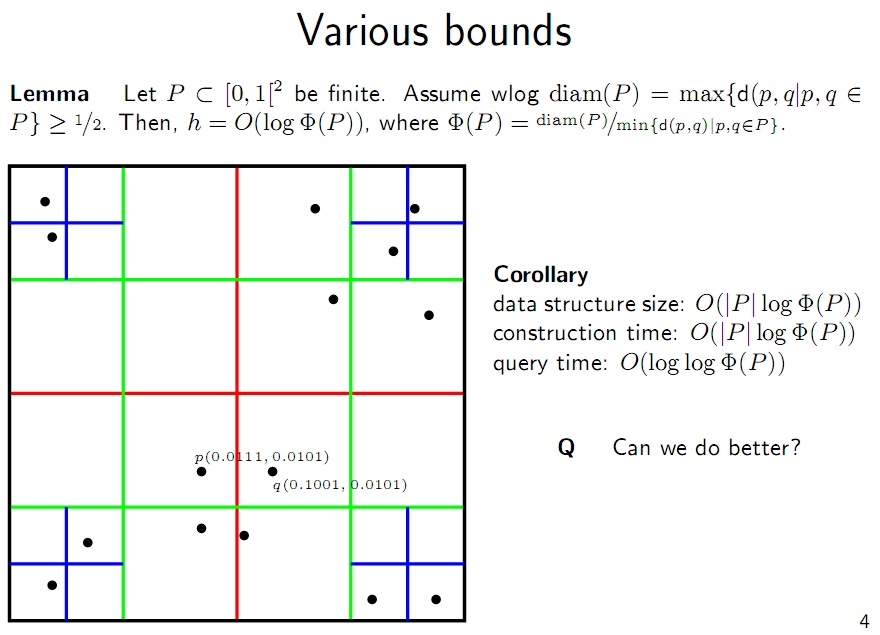 در مورد جوابش هم ایدهای ندارم که از چه مرتبهای میشه. فقط اینکه اگر یک خانه بزرگ زیر خط بیفتد دیگر تقسیم نمیشود و این باعث میشود که زمان خیلی بد نشود. در بدترین حالت به اندازهی مجموع ریزترین خانه تا درشتترین خانه باید چک کنیم که از مرتبه تعداد کوچکترین خانهها میشود که باید از مرتبه کوچکترین تعداد نقاط باشد وگرنه خانهها تقسیم نمیشدند.