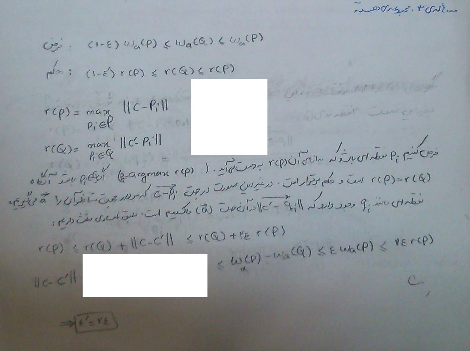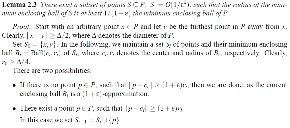 جوابی که این الگوریتم میدهد ۳/۲-تقریبی است برای کوچکترین دایره محیطی نقاط و خود الگوریتم هم به این صورت است که به جای اینکه نقطه جدید و نقاط قبلی را در نظر بگیرد نقطه جدید و دایره محیطی قبلی را در نظر میگیرد و کوچکترین توپ محیطی آن را حساب میکند.