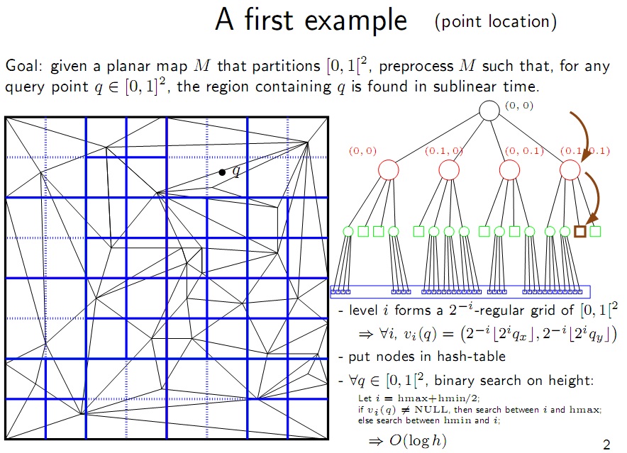راه حل دوم: برای هر خانه مجدداً تقسیم بندی مشابه درخت چهارتایی را انجام بدهیم با این تفاوت که هر خانه را به رأس متناظر آن هش کنیم. در این صورت با تقسیم مختصات نقطه کوئری و جزء صحیح گرفتن از آن به خانهی جدول هش میرسیم و ناحیه متناظر آن را گزارش میکنیم. برای پیدا کردن برگ شامل نقطه کوئری از جستجوی دودویی استفاده میکنیم تا نیاز نباشد کل عمق درخت را برویم.