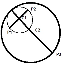 در شکل بالا همیشه اگر از p3 به نقطه مماس وصل کنیم، چون شعاع در نقطه تماس بر خط مماس عمود است اگر از c1 بگذرد از c2 هم میگذرد. در غیر این صورت یک نقطهی دیگر روی محیط دایره دوم باید باشد تا این دایره کوچکترین دایره محیطی باشد. (حالت دو سر قطر اتفاق نمیافتد.)