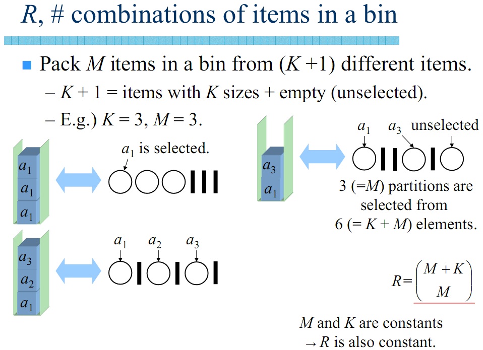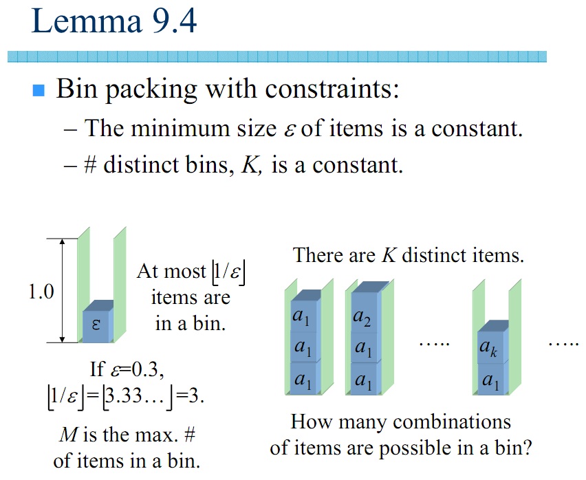 *تعدادی شئ با اندازههای بین e(اپسیلون) و ۱ داریم که حداکثر K اندازه مختلف دارند و میخواهیم آنها را در کمترین تعداد سطل با اندازه یک جا بدهیم.