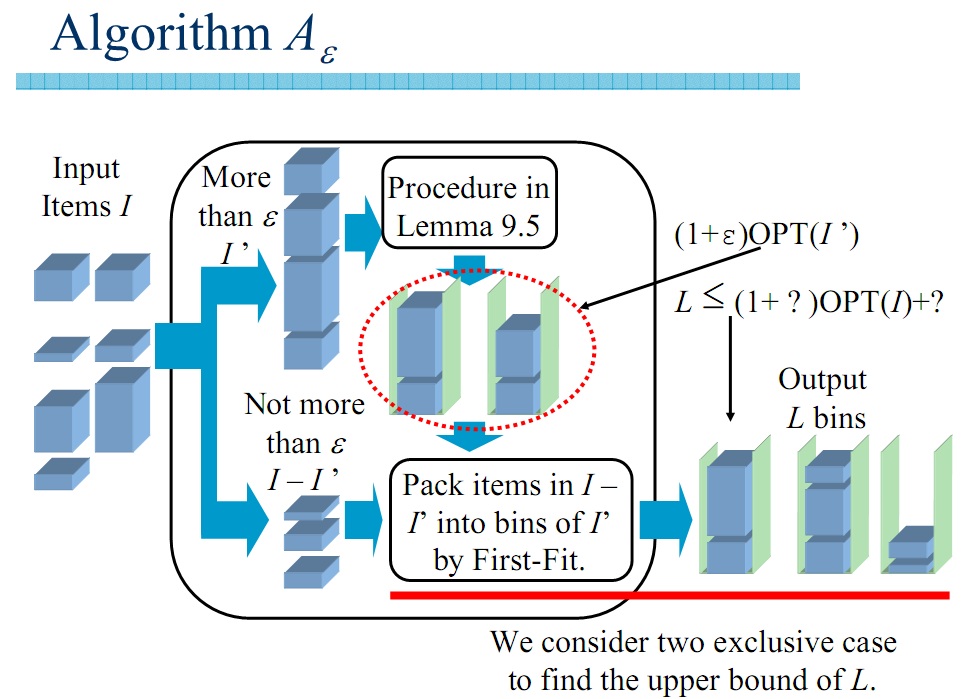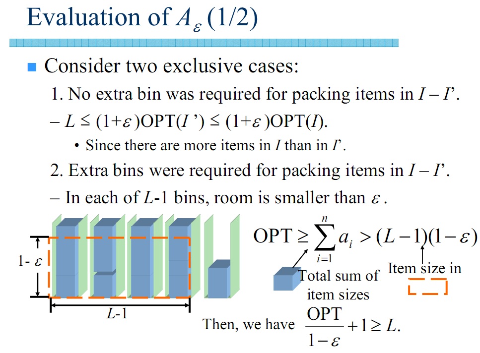 ما هنوز از یکی از اطلاعاتی که از مسأله داریم استفاده نکردهایم. اگر اشیا وزن بیشتر مساوی ۰.۵ داشته باشند، میتوانیم جواب بهینه آن را در زمان خطی به دست بیاوریم. چون در هر سطل حداکثر یک شئ قرار میگیرد. اگر اشیا وزن کمتر از ۰.۵ داشته باشند، آنها را حریصانه در جعبهها میچینیم و به الگوریتم با ضریب تقریب ۱+۲*اپسیلون میرسیم.
