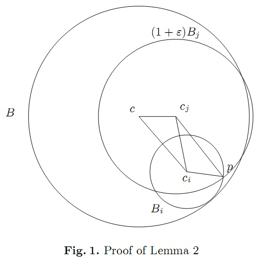 فرض کنید Pi روی محیط دایره ی بهینه (B*) باشد. (این بدترین حالتی است که می تواند رخ بدهد.) دایره ای که Pi روی محیط آن است Bi می نامیم که مرکز ci و شعاع ri دارد. ti را هم فاصله ci (مرکز دایره iام) تا محیط دایره بهینه می گیریم، در امتداد خط گذرنده از Pi. (فاصله بین Pi و ci که ri است نه سمت دیگر!)