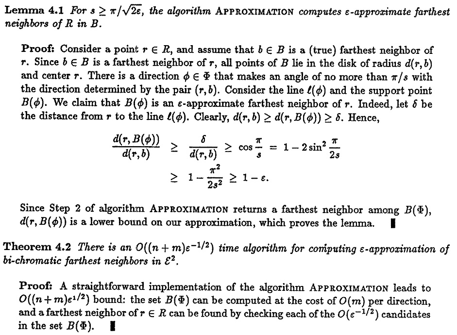 به صورت تصادفی زیرمجموعه ای m/4 عضوی از نقاط آبی انتخاب می کنیم و مجموعه نقاط قرمز را به دو مجموعه n/2 عضوی افراز می کنیم و مساله را برای این زیرمساله ها حل می کنیم. به ازای نقطه قرمز iام و دورترین همسایه آبی آن b'i تعریف می کنیم: Si را توپ به مرکز نقطه قرمز و شعاع فاصله قرمز و آبی می نامیم و S'_i را خارج این توپ تعریف می کنیم. چون b'i دورترین همسایه ri بوده است، پس B' درون همه ی توپ های به مرکز نقاط قرمز می افتد و دورترین همسایه ri در B یا b'i است یا در S'i می افتد. پس نقاط اشتراک Si ها جواب ما نیستند.