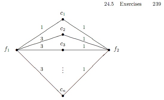 مثال صفحهی ۲۳۹ کتاب وزیرانی غلط است؟ چون اگر به مرکز facility دوم یک دایره به شعاع یک بزنیم، همهی شهرها روی آن میافتند. میدانیم c1 از f1 هم فاصلهی ۱ دارد، در نتیجه فاصلهی f1 از نقاط دایره به مرکز f2 حداکثر در یک نقطه ۳ میشود. (در حالتی که دو دایره مماس باشند و c1 نقطه تماس باشد سر دیگر قطر تنها نقطه به فاصله ۳ خواهد بود.)